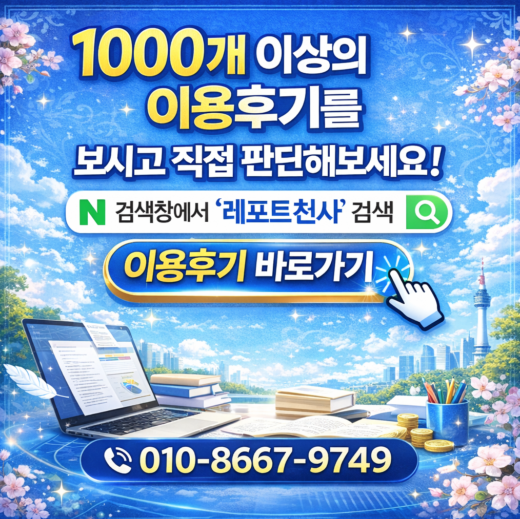 여러 업체를 비교해보다가 레포트천사를 선택하게 됐어요. 가장 큰 이유는 업력이었는데요, 2010년부터 현재까지 17년째 운영 중인 사업자등록업체예요. 단순히 오래됐다는 게 아니라 10만 건 이상의 작업 노하우가 쌓여 있고, 1,000개 이상의 실제 이용 후기가 있어서 신뢰가 갔어요. 다른 업체들과 비교했을 때 업력 자체가 비교 불가 수준이었거든요. 아무 데나 맡겼다가 표절이나 AI 생성 내용이 들어가면 오히려 더 큰 낭패를 볼 수 있잖아요. 그 점에서 레포트천사는 확실히 검증된 곳이라는 느낌이 강하게 들었어요.